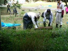| まさきフレッシュ会の皆様が、早朝よりビオトープの除草作業を行ってくださいました。 夏の間に背丈ほどに伸びた草や葦をきれいに刈っていただき、すっきりとしました。 中央の池の周りに並べてくださった土留め用の丸太は、真崎コミセン裏の古墳を整備したときに切り出したニセアカシアの木だそうです。 フレッシュ会の皆様、ありがとうございました。 |