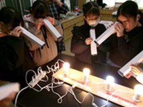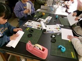 | J−PARCから講師の先生をお招きして、光の万華鏡づくりを行いました。 光について学習したあと、画用紙や偏光板を使った万華鏡を作りました。 星の形に空けた穴から光が入って、七色の光線が見えました。 どの児童も、集中して活動していました。 |
