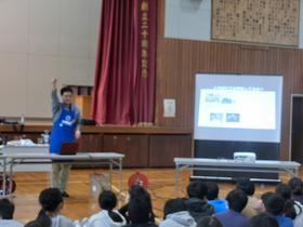 お楽しみ体験授業で和太鼓音楽集団「萌芽」のメンバーが来校し、3年生児童が和太鼓の体験を行いました。 大きな音に驚きながらも、みんな楽しんで太鼓を叩いていました。 |