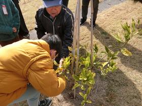 昨年度、真崎フレッシュ会のみなさんと一緒に、ミカンの苗を植えました。 グラウンド近くの日当たりがよい場所に植えた苗木には、大きなミカンの実がなっています。 他の苗木の成長も楽しみです。 |